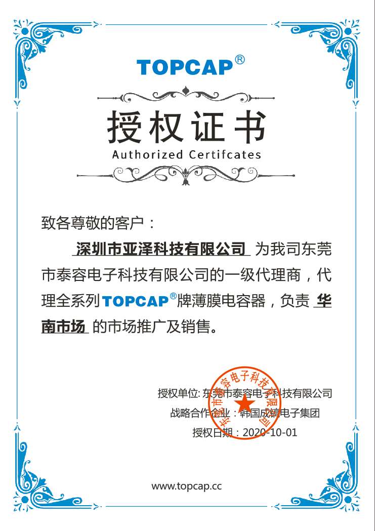 東莞市泰容電子科技有限公司授權我司為一級代理商,代理全系列TOPCAP牌薄膜電容器,負責華南市場的開發與推廣銷...